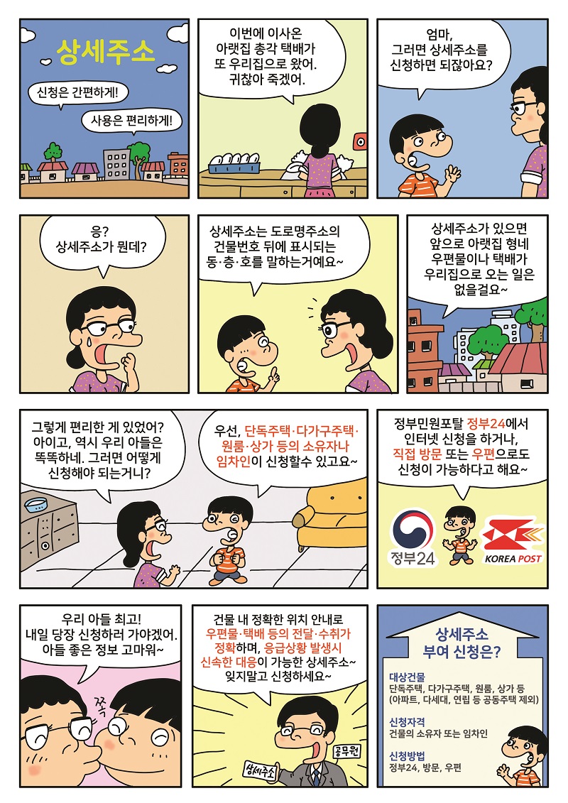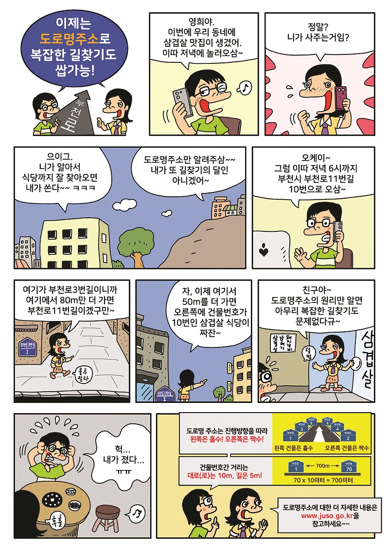 도로명주소의 원리 및 길 찾는 법, 상세주소의 개념·신청방법의 개념 등을 남녀노소 누구나 쉽게 이해할 수 있도록 주소정책 홍보콘텐츠를 개발하여 알립니다.