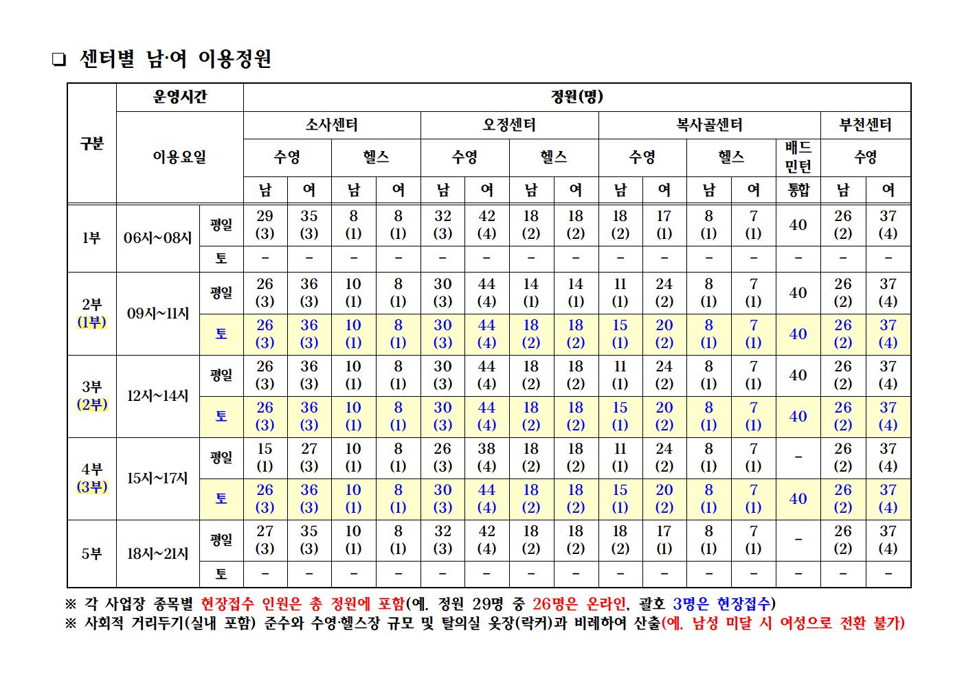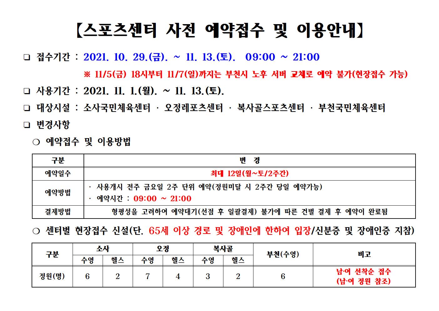 스포츠센터 사전 예약접수 및 이용안내 공지번호2021122 작성자 유** 등록일자 2021년 10월 27일 11시 10분 52초 조회 3,598 스포츠센터 사전 예약접수 및 이용안내001.jpg [ Size : 169.58KB , Down : 5,669 ] 미리보기 다운로드 스포츠센터 사전 예약접수 및 이용안내002.jpg [ Size : 224.86KB , Down : 5,223 ] 미리보기 다운로드 목록보기