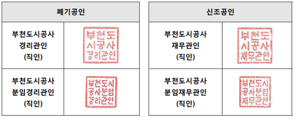 부천도시공사 설립 및 운영에 관한 조례 제39조 및 부천도시공사 공인관리규정 제10조 규정에 의거 공인 신조 및 폐기를 다음과 같이 공고합니다