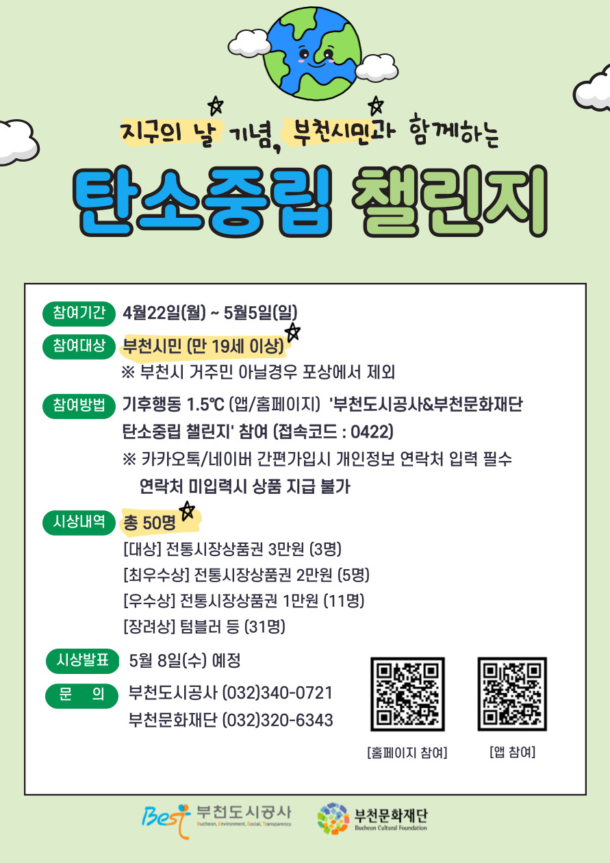 「부천도시공사&부천문화재단 탄소중립 챌린지」를 아래와 같이 시행하오니 많은 시민들의 관심과 참여 부탁드립니다.