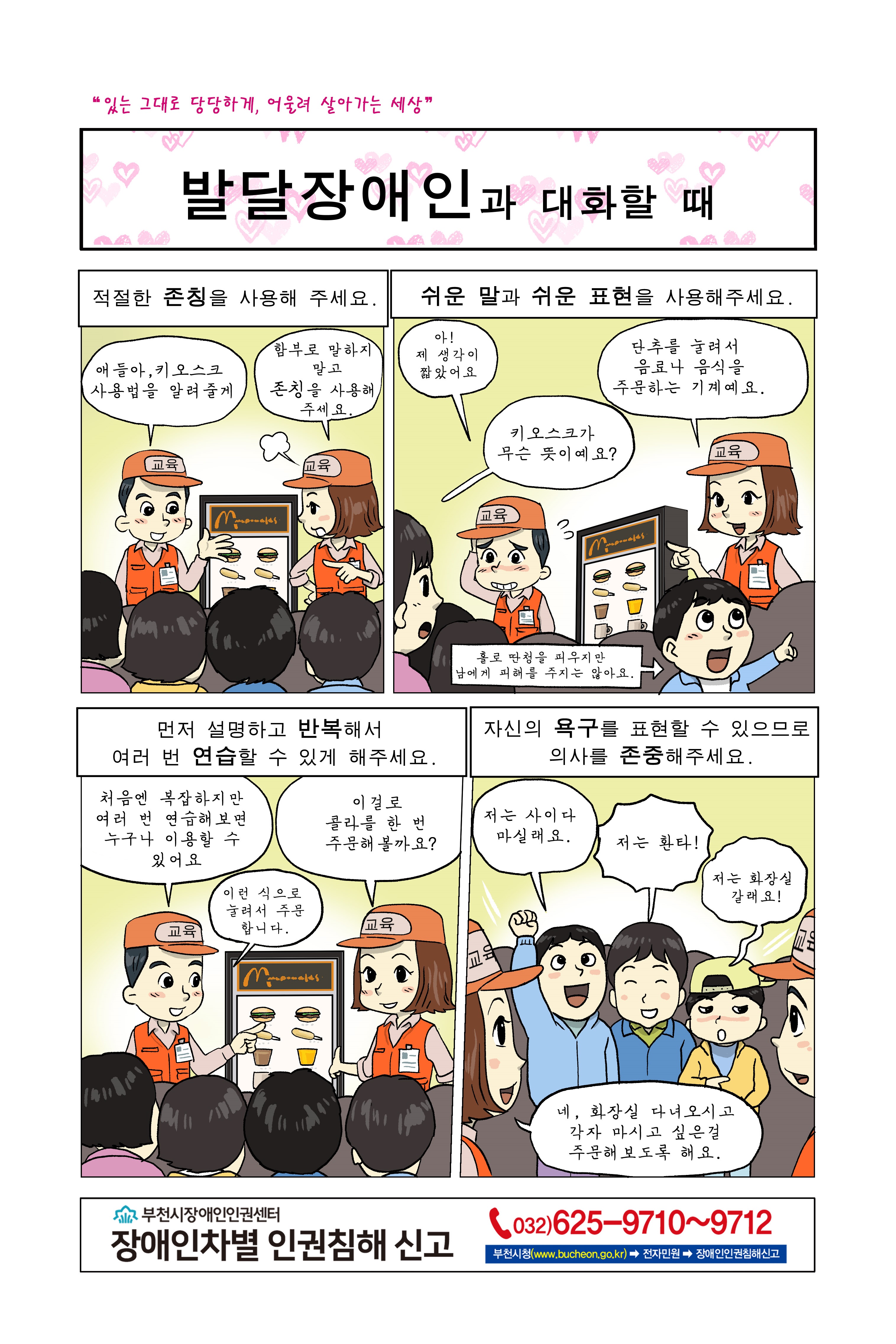부천시 장애인식개선 만화콘텐츠 홈페이지 게시 알림 및 홍보 공지번호20221 작성자 관** 등록일자 2022년 1월 11일 9시 50분 30초 조회 818 부천시 홈페이지 접속 경로 바로가기 뇌병변장애인이도움이필요할때.jpg [ Size : 1.64MB , Down : 825 ] 미리보기 다운로드 발달장애인과 대화할 때.jpg [ Size : 2.06MB , Down : 411 ] 미리보기 다운로드 시각장애인이 도움을 요청할 때.jpg [ Size : 2.05MB , Down : 555 ] 미리보기 다운로드 청각장애인과 친구가 될 때.jpg [ Size : 1.85MB , Down : 1,155 ] 미리보기 다운로드 목록보기