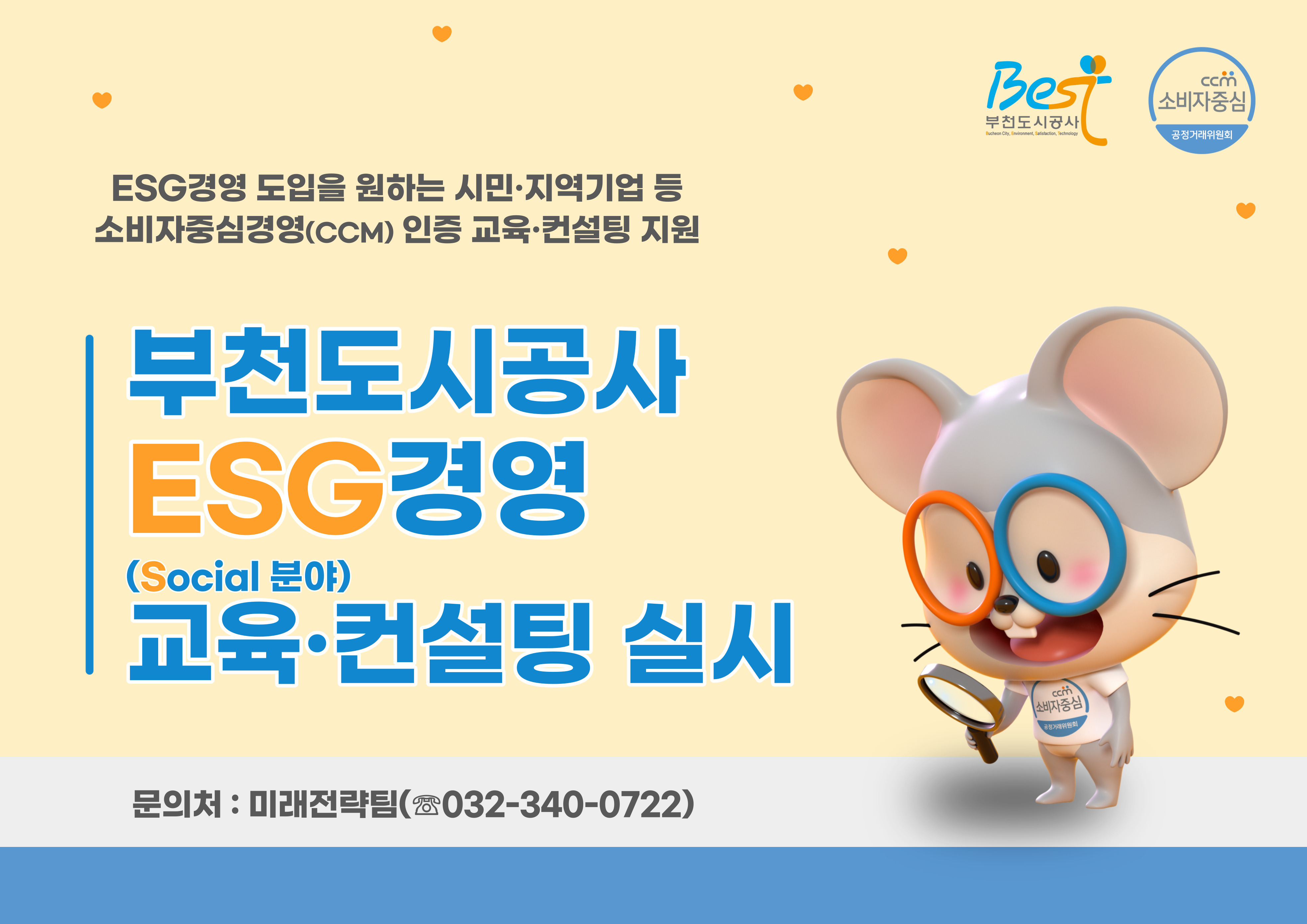 ■ 부천도시공사는 2014년 7월부터 고객중심경영을 도입, 공정거래위원회가 주관하는 소비자중심경영(CCM) 인증을 5회 연속 획득하였으며, 소비자권익보호에 이바지한 공로를 인정받아 2020년 소비자중심경영 최우수기업으로 국무총리 표상을 수상하였습니다. ■ 이에 부천도시공사는 부천시 지역기업과의 협력을 강화하고, 지역기업의 ESG(환경·사회·지배구조)경영 사회 분야를 지원하기 위해 소비자중심경영(CCM) 관련 교육과 컨설팅을 지원하오니 ESG경영에 관심있는 지역기업 및 시민 여러분들의 많은 참여 바랍니다. |