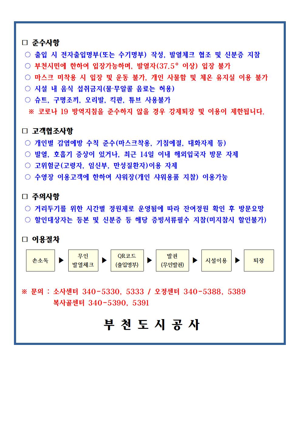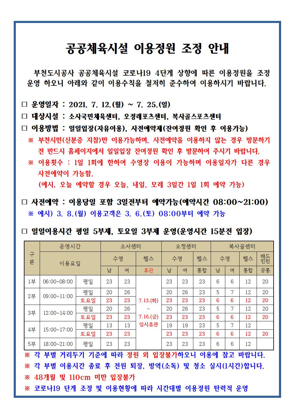 레포츠사업부 공공체육시설(소사.오정.복사골) 이용가능인원 변경 안내 공지번호202162 작성자 유** 등록일자 2021년 7월 12일 11시 40분 27초 조회 1,077 공지사항001.jpg [ Size : 244.55KB , Down : 938 ] 미리보기 다운로드 공지사항002.jpg [ Size : 169.36KB , Down : 920 ] 미리보기 다운로드 목록보기