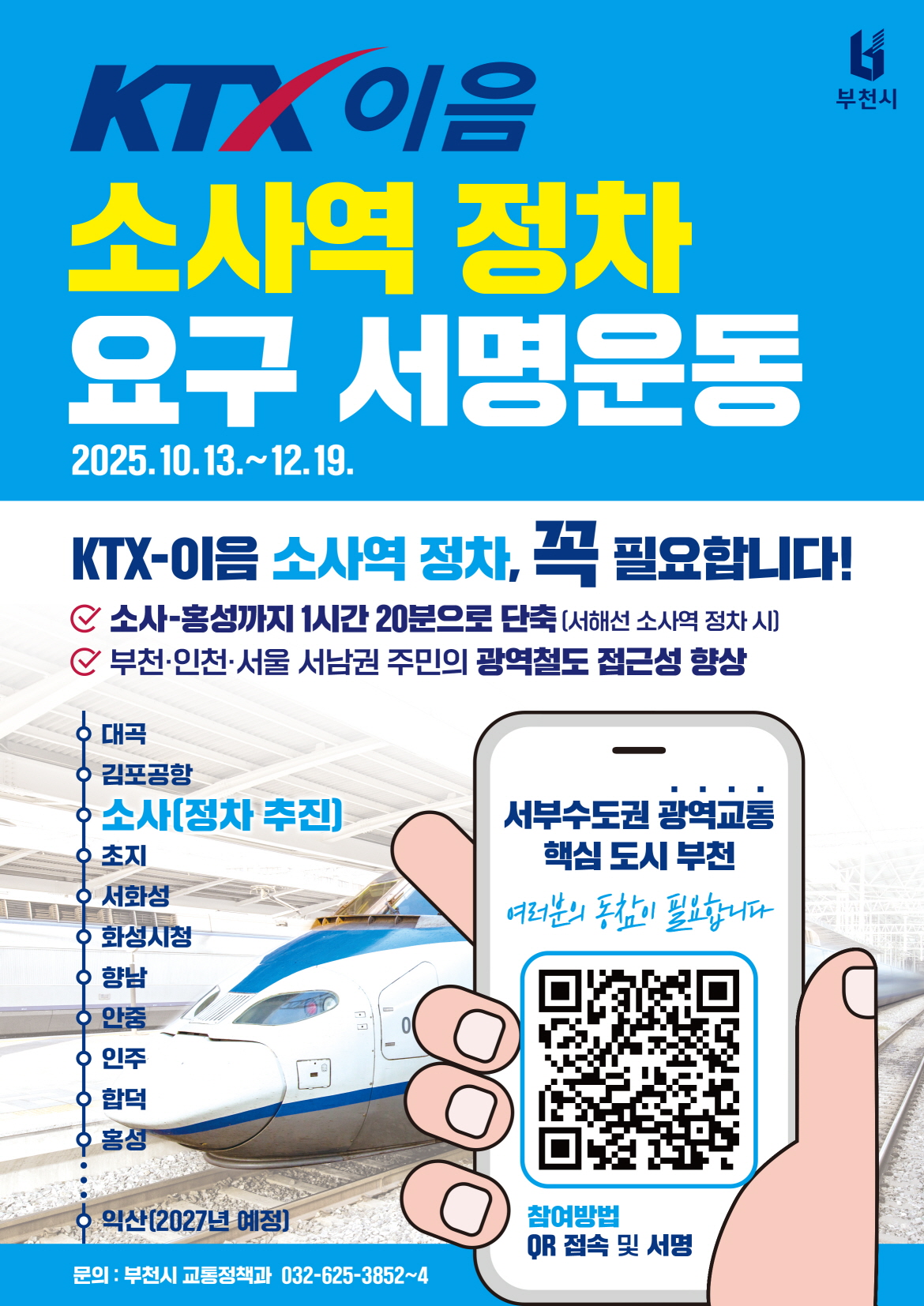 KTX 이음 소사역 정차 요구 서명운동 공지번호2025169 작성자 조** 등록일자 2025년 10월 27일 16시 53분 45초 조회 328 부천시에서는 서해선 KTX-이음 열차의 소사역 정차 추진을 위해 시민 공감대 확산과 참여 유도를 목적으로 10만 시민 서명운동을 진행하고 있습니다. 많은 참여부탁드립니다. KTX이음 소사역 정차 서명운동_포스터2.jpg [ Size : 815.08KB , Down : 164 ] 미리보기 다운로드 목록보기