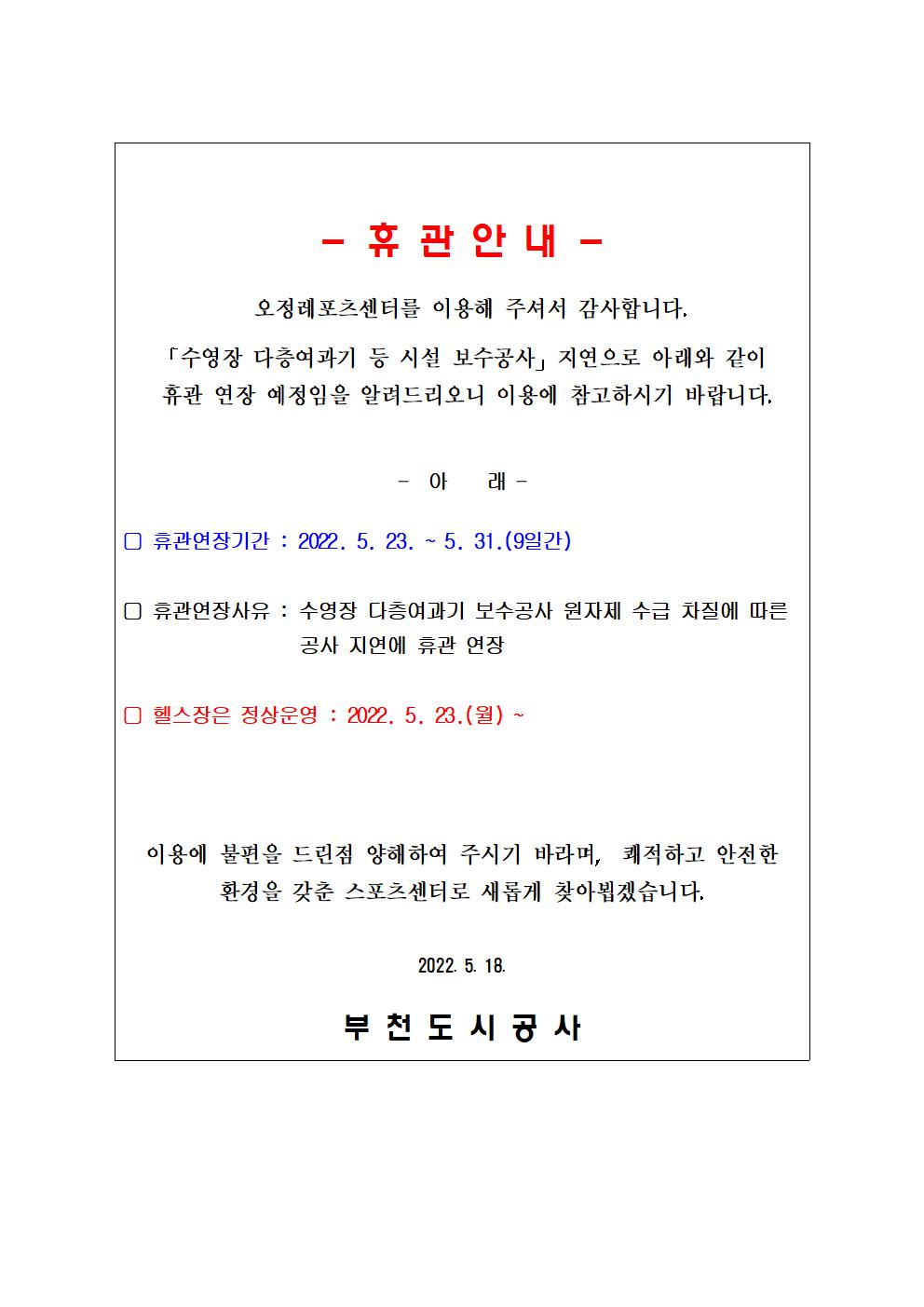 오정레포츠센터 수영장 휴관 연장 안내 공지번호202269 작성자 노** 등록일자 2022년 5월 18일 17시 9분 28초 조회 1,394 image001.jpg [ Size : 88.31KB , Down : 1,607 ] 미리보기 다운로드 목록보기