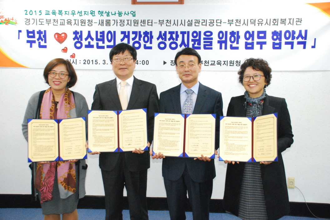 부천시시설관리공단, 청소년 지원사업 업무 협약 체결 부천시시설관리공단-부천교육지원청-새롬가정지원센터-덕유사회복지관 참여 |