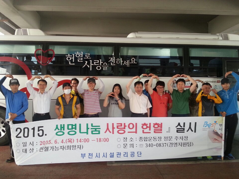 부천시시설관리공단(이사장 임명호)은 6월 4일 부천종합운동장에서 혈액 한 방울의 따뜻한 온기로 생명을 나누고자「2015. 사랑의 헌혈」행사에 동참했다.