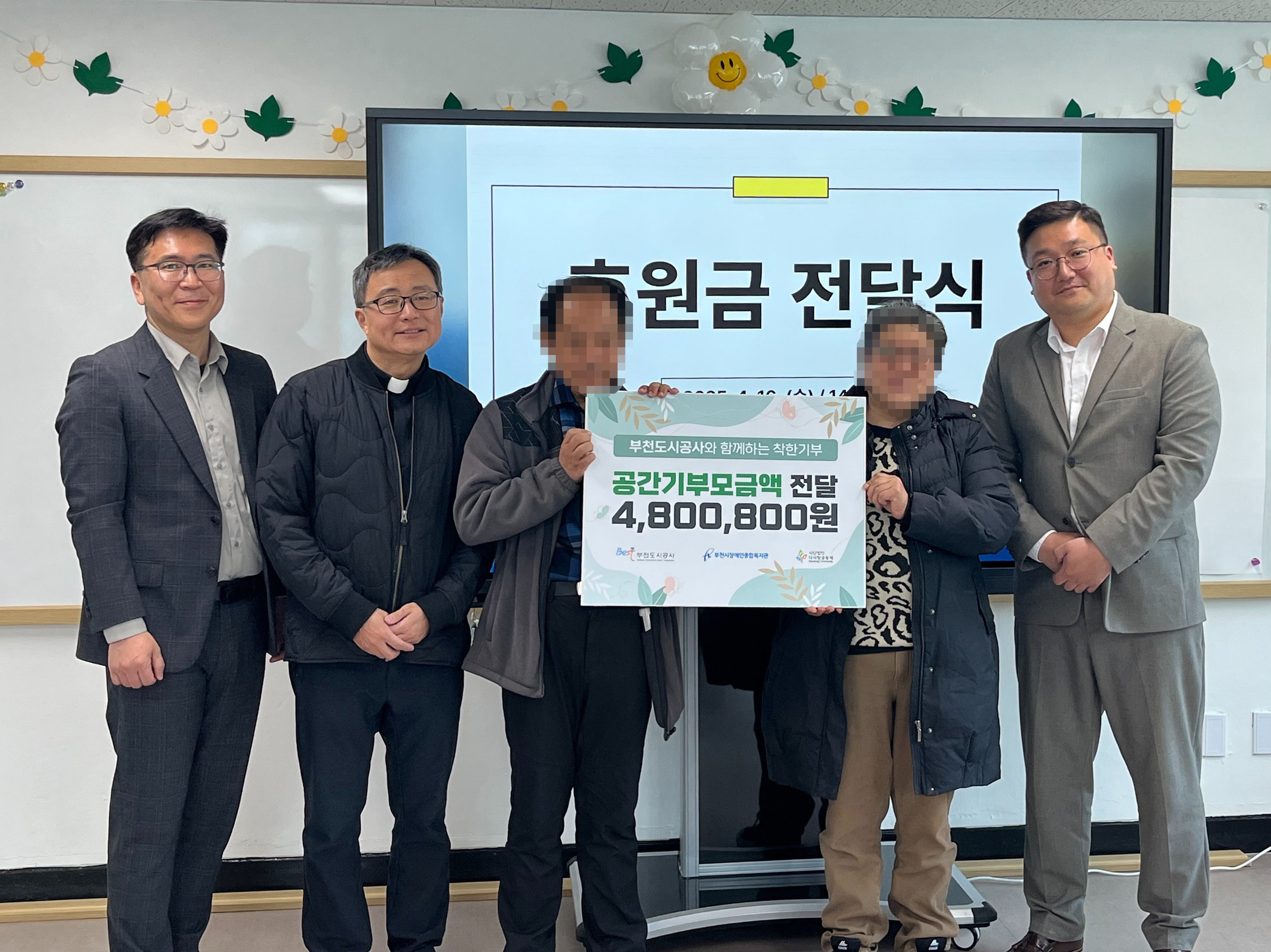 부천도시공사(사장 원명희)는 16일, 사단법인 다사랑공동체(대표 성재호)와 함께 진행한 ‘공간기부 캠페인’을 통해 조성된 모금액 등 약 480만 원을 관내 취약계층에게 전달했다고 밝혔다.