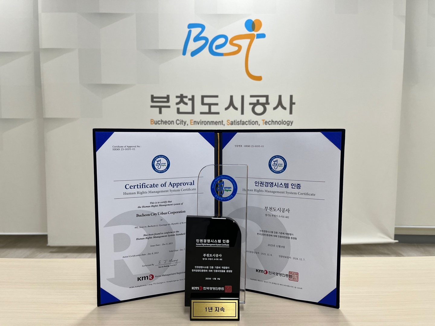 부천도시공사(사장 원명희)는 인권경영 체계 구축 성과를 인정받아 한국경영 인증원(KMR)으로부터 인권경영시스템 인증을 획득했다고 14일 밝혔다.