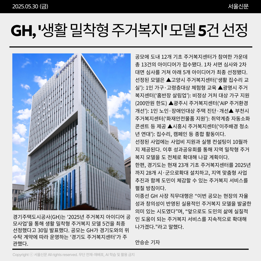 ★ 기사원문보기 : GH, ‘생활 밀착형 주거복지’ 모델 5건 선정 | 서울Pn