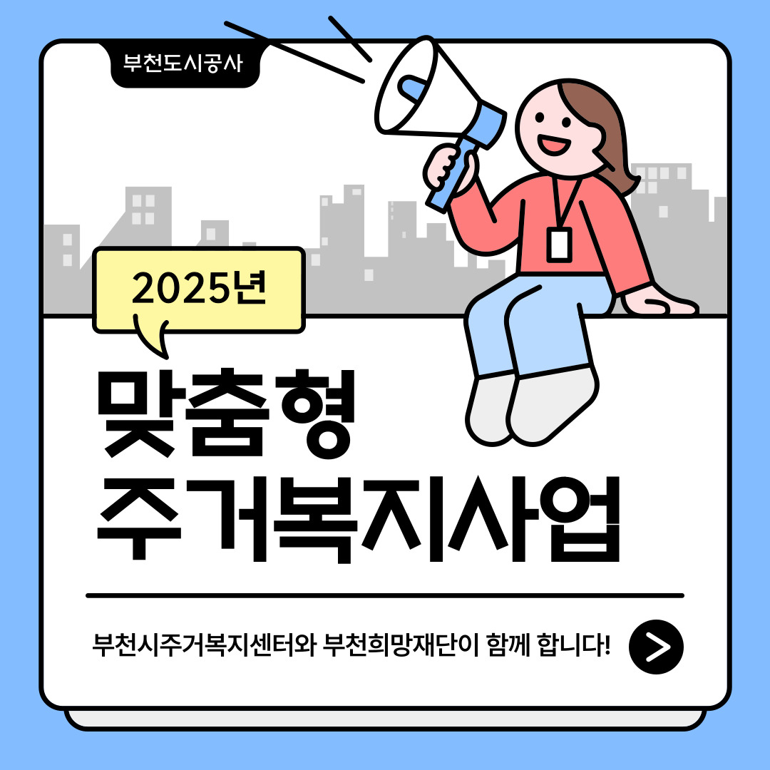 2025년 주거환경개선 프로젝트 "맞춤형 주거복지 사업" 안내 작성자 구** 등록일자 2025년 4월 17일 13시 14분 15초 조회 373 안녕하세요? 부천시주거복지센터입니다.많은 관심과 신청 부탁드립니다. 주거안심케어서비스(목록) < 주거환경 개선사업 < 사업소개 < 주거복지 : 부천도시공사 001.jpg [ Size : 157.87KB , Down : 159 ] 미리보기 다운로드 맞춤형 주거복지 사업 안내.pdf [ Size : 2.65MB , Down : 226 ] 미리보기 다운로드 목록보기
