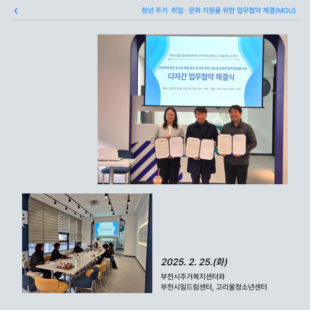 청년 주거 취업 문화지원을 위한 업무협약 체결 작성자 구** 등록일자 2025년 2월 27일 18시 0분 2초 조회 303 2025년 2월 25일(화) 부천시일드림센터 3섹터에서부천시주거복지제선-일드림센터-고리울청소년센터가 업무 협약을 체결하였습니다.청년들의 주거에서 일자리, 문화까지 종합적으로 지원 합니다. 협약식.jpg [ Size : 208.5KB , Down : 175 ] 미리보기 다운로드 목록보기