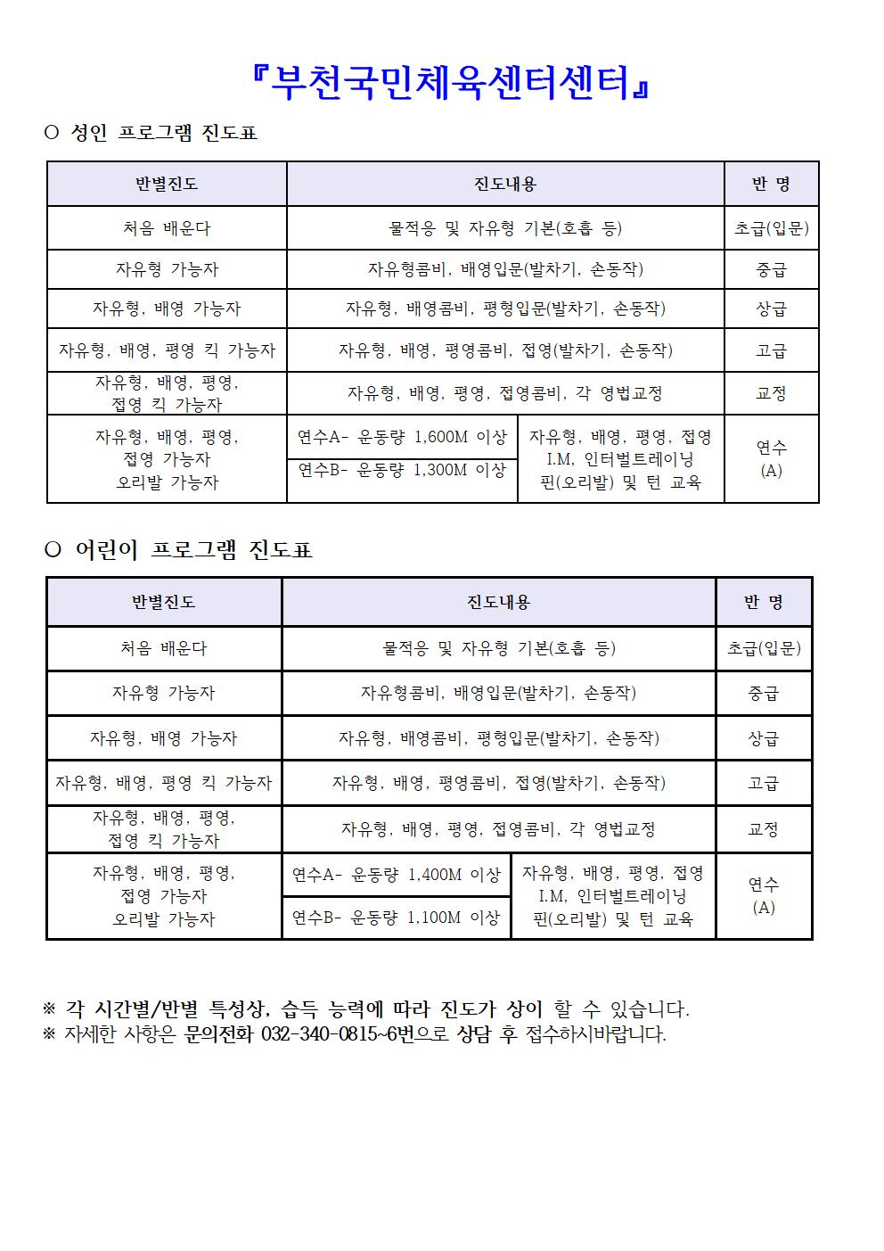 ※ 신규수영 등록 시 강습진도에 맞게 접수하시기 바랍니다(강습진도표 첨부파일참조)