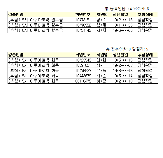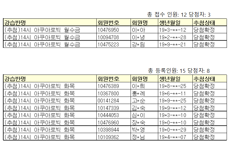 2026년 3월 부천국민체육센터 아쿠아로빅 추첨 당첨자 안내