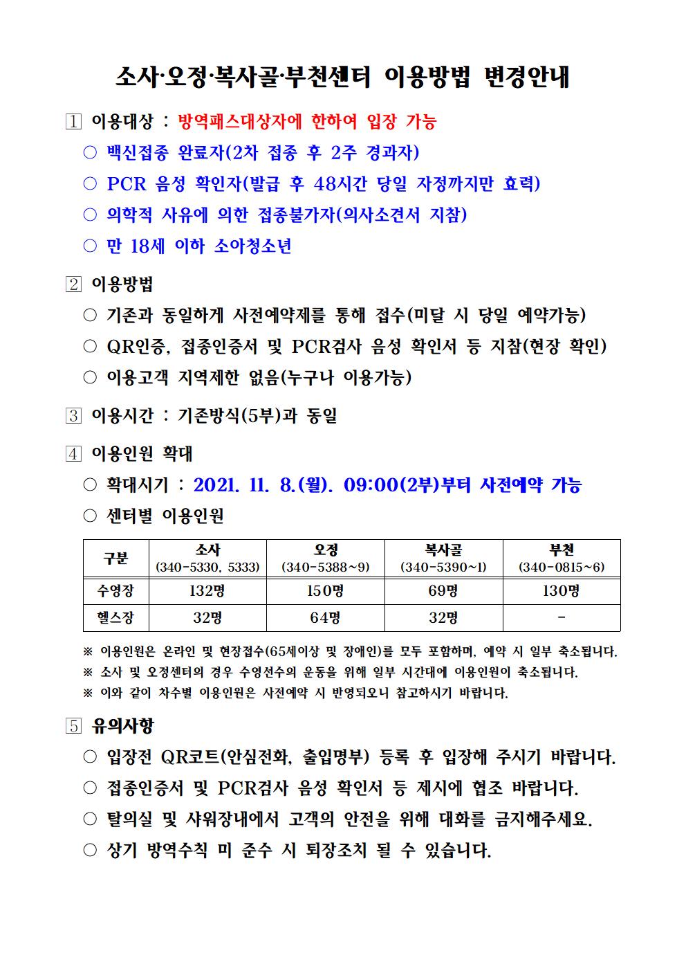 부천도시공사 체육시설(소사.오정.복사골.부천센터) 이용방법 변경안내 공지번호2021124 작성자 유** 등록일자 2021년 11월 3일 11시 42분 23초 조회 2,421 공지사항001.jpg [ Size : 182.47KB , Down : 3,317 ] 미리보기 다운로드 목록보기