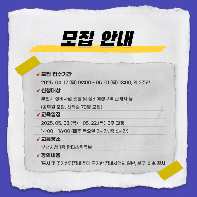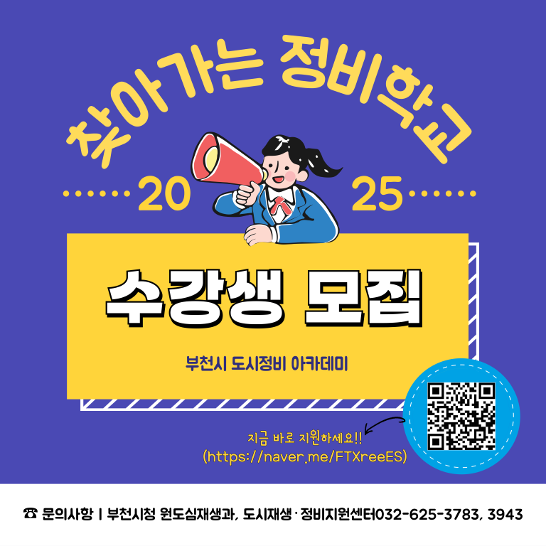2025년 부천시 도시정비 아카데미 "찾아가는 정비학교" 수강생 모집 안내 공지번호202565 작성자 김** 등록일자 2025년 4월 23일 10시 10분 4초 조회 378 1.png [ Size : 148.28KB , Down : 241 ] 미리보기 다운로드 2.png [ Size : 614.38KB , Down : 237 ] 미리보기 다운로드 3.png [ Size : 594.59KB , Down : 224 ] 미리보기 다운로드 4.png [ Size : 595.71KB , Down : 229 ] 미리보기 다운로드 목록보기