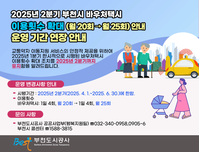 [부천시 교통약자이동지원센터] 2025년 2분기 부천시 바우처택시 한시적 월 이용횟수 확대 운영 기간 연장 안내