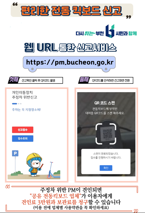 무단방치 전동킥보드 견인 시행 ○ 견인대상 : 주·정차 금지구역에 주차되어 민원신고시스템으로 신고접수 후 3시간이 지난 대여업체의 개인형 이동장치(전동킥보드) ○ 신고방법 : 민원신고시스템(https://pm.bucheon.go.kr) 접속 후 QR코드 스캔을 통한 신고 ○ 견인 및 신고가능시간 : 평일 09:00 ~ 18:00(토·일, 공휴일 제외) ○ 견인대상지역 : 붙임문서 참고 ○ 견인요금 : 「부천시 견인자동차 운영에 관한 조례」준용
