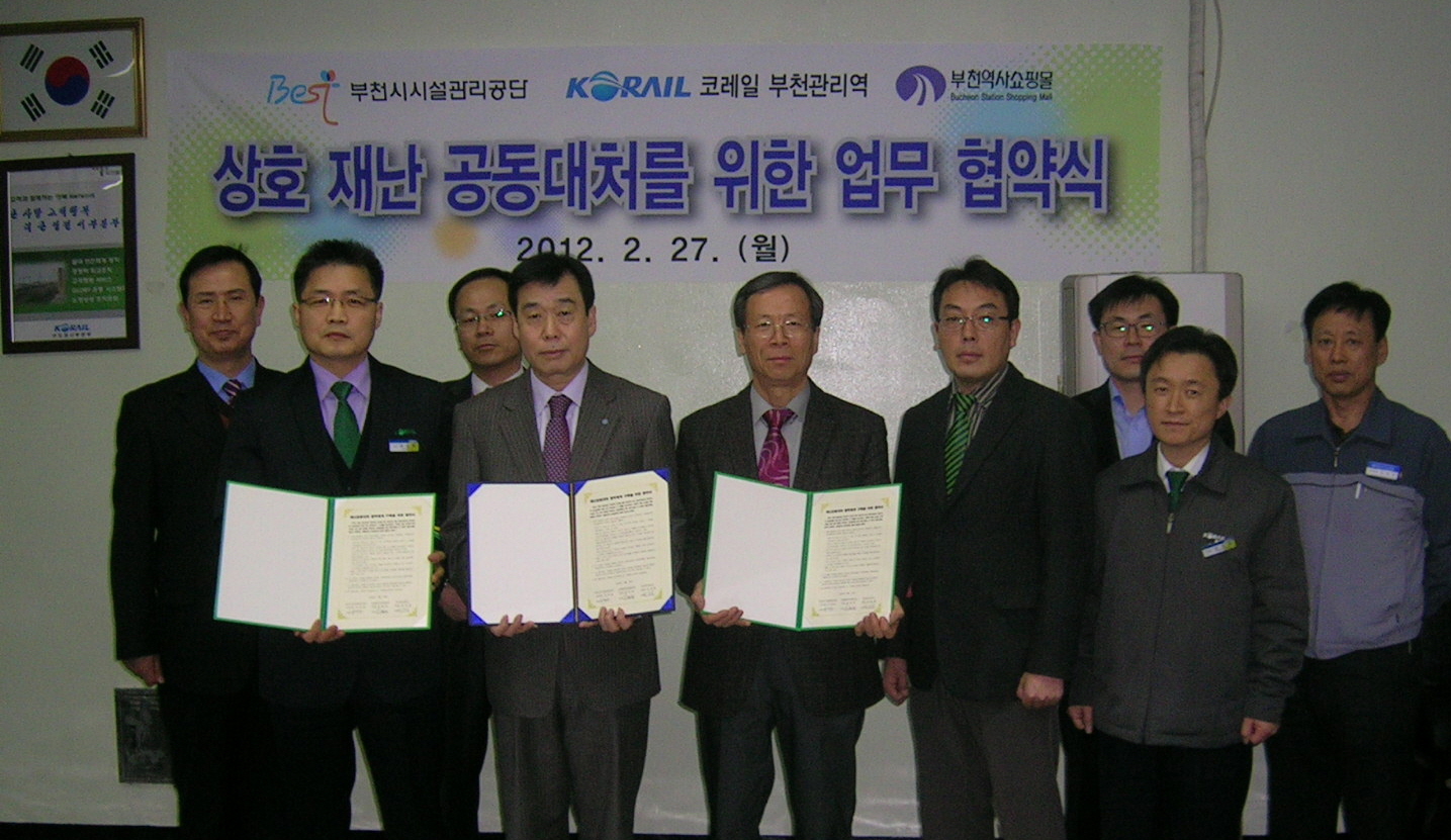 부천시시설관리공단(이사장 박명호)은 지난 27일 코레일 부천관리역, 부천역사(주)와 재난 공동대처 협력체계 구축을 위한 업무 협약을 체결하였다. 부천역에서 열린 업무 협약식에는 3개 기관 대표와 한국소방안전협회 국형호 교수가 참석하였으며, 부천역사 시설에서 발생하는 안전 및 재난 사고에 대한 공동대처로 피해를 최소화하는 것이 본 협약의 주요 골자이다. 부천에서 이용고객과 유동인구가 많은 시설 중 하나인 부천역사는 안전사고 예방과 재난에 대한 체계적인 시스템이 절실한 곳 중에 하나로 3개 기관의 상호 협력을 위한 첫걸음은 큰 의미를 지니고 있다. 협약식에 참석한 한국소방안전협회 국형호 교수는 “공공기관과 민간기관이 함께 재난협력체계를 만들기가 쉽지 않은데, 이번 협약이 전국적으로 좋은 사례가 될 것”이라며 긍정적 측면을 강조하였다. 공단 박명호 이사장 또한 “현재 35년이 경과된 노후시설인 부천역지하도상가의 안전사고 및 재난 예방에 최선을 기울이고 있다”며, “금번 협약을 계기로 3개 기관의 역량을 모아 고객이 안심하고 편하게 시설을 이용할 수 있도록 더욱 체계적인 안전예방에 힘을 쏟겠다.”고 밝혔다. |