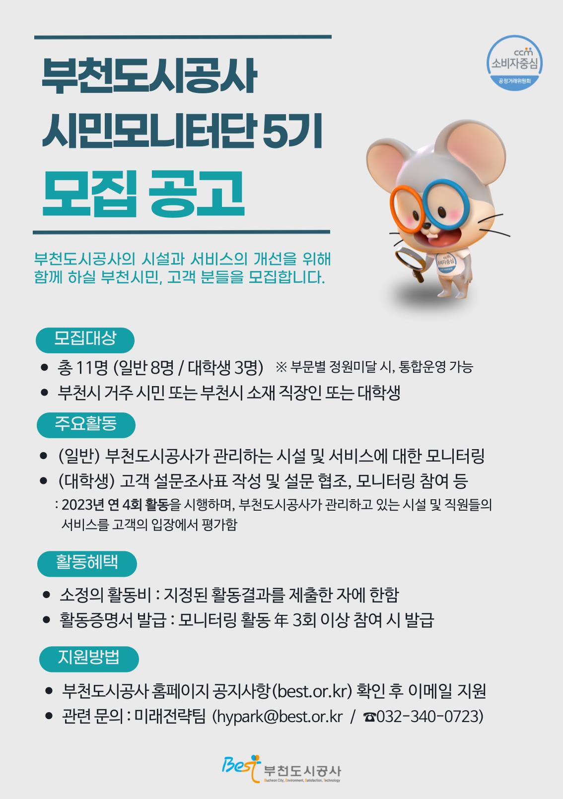 부천도시공사(사장 원명희)는 8일부터 17일까지 10일 동안 ‘제5기 시민모니터단’을 모집한다.