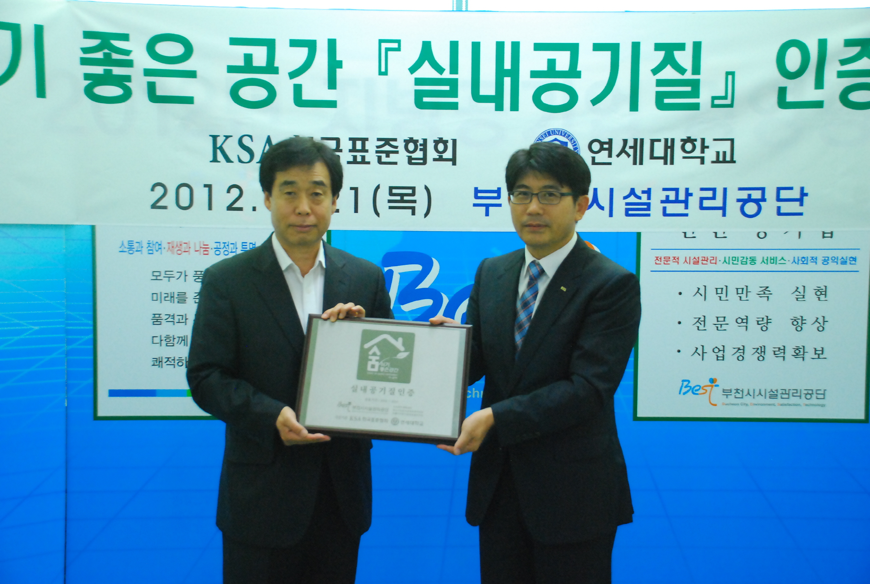 부천시시설관리공단(이사장 박명호)이 지난 6월 21일 기초자치단체 산하공기업 최초로 숨쉬기 좋은공간『실내공기질』인증을 획득하는 쾌거를 이뤄냈다. 21일 공단에서 개최된 숨쉬기 좋은공간『실내공기질』인증 수여식에는 한국표준협회 권오성 지식서비스팀장, 김운식 선임연구원 등이 참석하여 인증서와 인증패를 전달하였다. 그간 시민의 숲 조성 참여, 1사 1산 가꾸기 운동, 환경전문기관 인천환경공단과의 협약 체결 등 지속적으로 정부의 저탄소 녹색성장 정책에 적극 동참해온 부천시시설관리공단은 고객에게 더 나은 녹색환경과 건강한 실내공기를 제공하고자 지난 2월부터 고객이 많이 찾는 다중이용시설 3개소(소사국민체육센터, 비둘기어린이공원공영주차장, 윗소사어린이공원공영주차장)를 대상으로 숨쉬기 좋은 공간『실내공기질』인증을 추진해왔다. 본 인증은 KSA한국표준협회와 연세대학교가 공동 인증기관으로 주관하고 있으며, 최근 각종 환경오염과 건축자재 내 화학물질 등에 따른 실내 오염원의 증가로 실내공기질의 중요성이 심화됨에 따라, 다중이용시설, 학교, 작업장 등 대상 시설에 대해 숨쉬기 좋은공간으로 인증해주는 제도이다. 현재까지 홈플러스, 롯데백화점, 롯데월드, 코엑스, CGV 등의 대기업에서 숨쉬기 좋은공간 인증을 획득했다.
