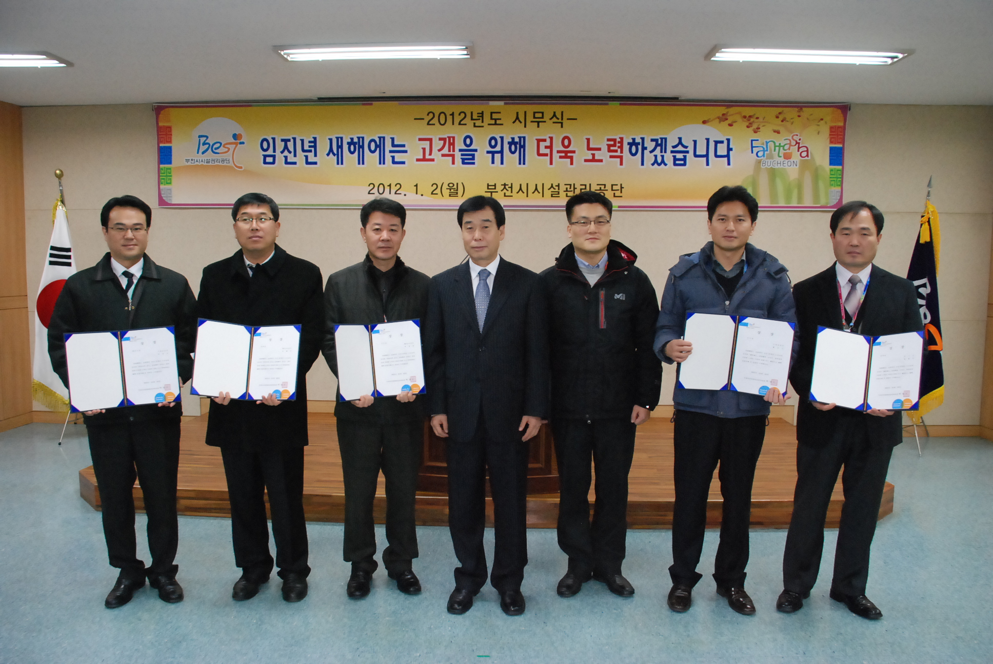 부천시시설관리공단(이사장 박명호)은 지난 2일 오전 11시에 임진년 한해를 여는 시무식을 갖고 새로운 한 해를 시작했다. 공단 대회의실에서 열린 2012. 시무식에는 각종 유공 및 모범직원에 대한 표창 및 시상, 신년사 낭독, 직원과의 신년인사의 순으로 진행되었으며, 박명호 이사장은 신년사를 통해 올해 경영방침을 ‘안정과 도약, 소통과 경청으로 시민행복을 창조하는 선진공기업’으로 제시하고, 전 직원의 역량 결집을 당부했다. 특히, 이번 시무식에서는 제안제도 및 아이디어 공모전에 입상한 직원들이 부상으로 받은 시상금의 기부가 줄을 이어, 세밑 새해부터 지역사회 공헌에 따뜻함을 더했다. 아름다운 기부에 참여한 직원은 제안제도 수상자 계동순, 최형진, 조영동 직원과 아이디어 공모전 수상자인 박제선, 임성균, 박명삼 직원이며, 이들이 기부한 총 110여만원은 추후 소외계층 및 사회적 약자를 돕는데 전액 사용하게 된다. 이번 기부에 참여한 한 직원은 “임진년 새해를 시작하면서 수상자들이 주위의 어렵고 소외된 이웃들을 위해 가치있는 일을 하기로 마음을 모았다. 작은 마음이지만 희망의 불씨로 전달되길 바란다.”며 소감을 밝혔다. |