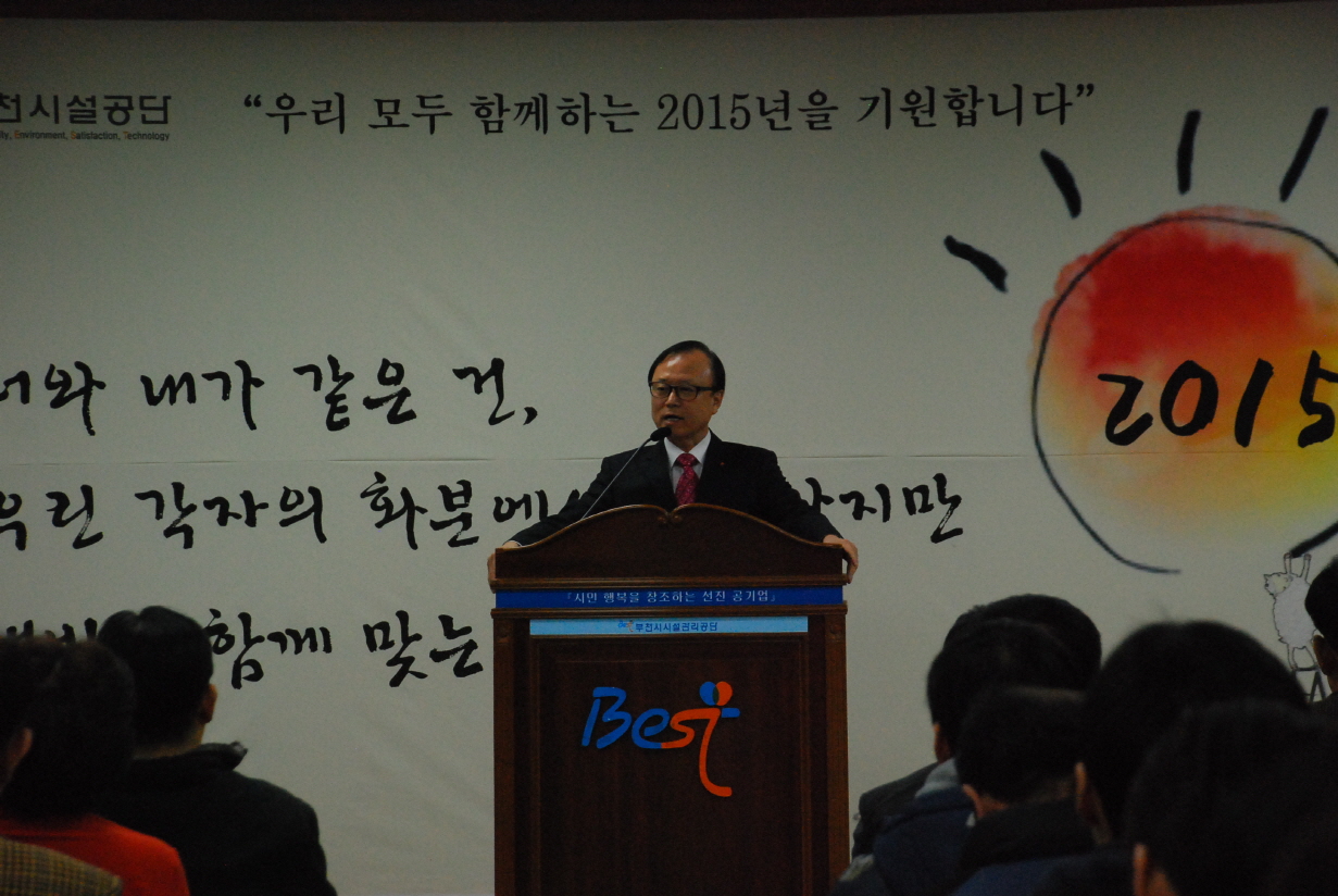 공단 대회의실에서 열린 2015년 시무식은 유공직원 표창, 직원 호칭 도입에 따른 명함 전달식 및 지식 경영을 위한 도서 증정식과 더불어 임·직원이 함께하는 ‘희망의 나라로’ 합창을 통해 꿈과 희망의 조직문화를 만들어나가자는 의미 있는 시간을 가졌다.