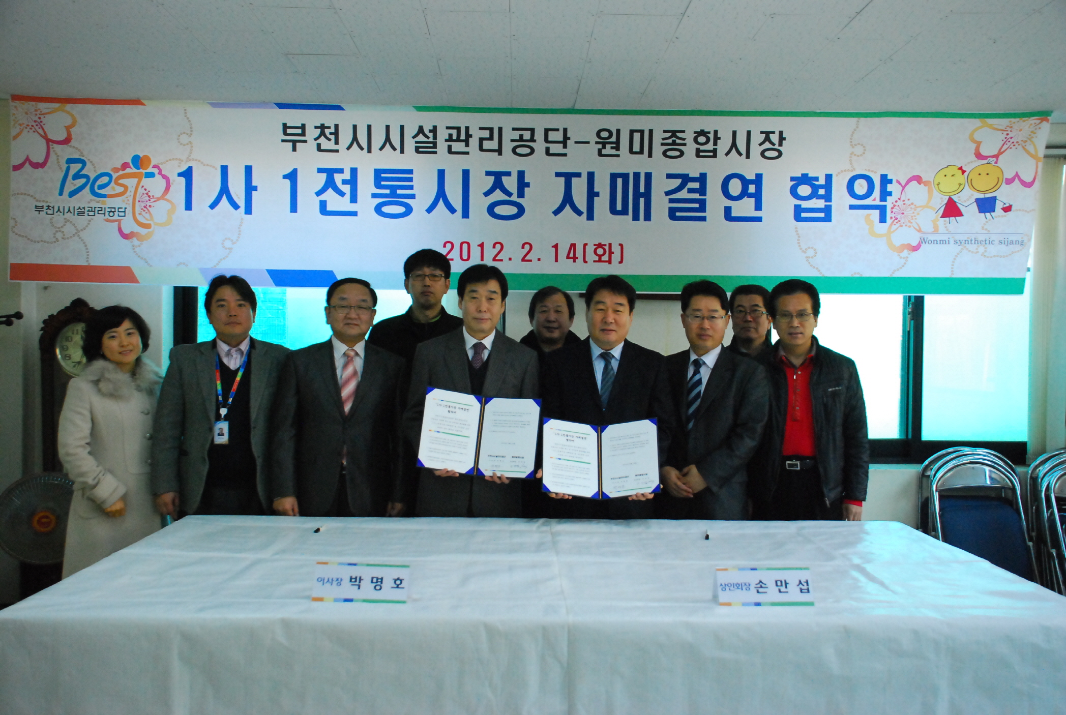 부천시시설관리공단(이사장 박명호)은 2월 14일 원미종합시장과 “1사 1전통시장 자매결연” 협약을 체결하였다. 원미종합시장 상인회 사무실에서 열린 협약식에는 공단 박명호 이사장, 원미종합시장 손만섭 상인회장을 비롯하여, 양측의 간부 및 실무자가 참석하여 진행되었다. 전통시장의 자생력을 제고하고 지역경제 활성화를 도모하기 위해 추진된 본 협약은, 공단에서 매월 1회 전통시장 이용의 날 지정 운영, 재래시장(온누리) 상품권을 활용한 각종 행사 물품 및 사회공헌 위문품 구매, 전문 기술 인력을 활용한 노후화된 시장 시설물 개보수 지원 등이 있으며, 원미종합시장에서는 앞으로 공단에 양질의 물품과 서비스를 제공하게 된다. 또한, 앞으로 상호 홍보 지원 활동도 함께 전개하기로 하는 등 지방공기업과 전통시장이 상생하는 우수 사례로 남을 것으로 보인다. 협약식에 참석한 공단 박명호 이사장은 “원미종합시장과의 본 협약을 계기로 공단에서 지속 추진 중인 다양한 사회공헌 활동과 접목하여, 지역경제 활성화는 물론, 이웃에게 사랑과 행복을 나눠주는 공단상 구현에 더욱 노력하겠다.”며 소감을 밝혔다. |