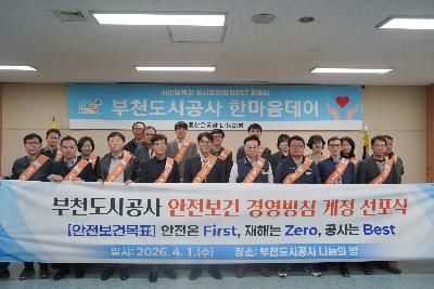 게시판 검색 표시줄수 : 3개씩 보기6개씩 보기9개씩 보기12개씩 보기15개씩 보기18개씩 보기21개씩 보기24개씩 보기27개씩 보기30개씩 보기 검색 대상 : 전체 검색제목내용 검색어 : 검색 총 175건(1/20페이지) 안전보건 경영방침 개정 선포식 2026-04-02 인권독서토론회 2025-07-21 우리쌀 소비촉진 '아침밥 먹기' 캠페인 2025-06-25 송내국민체육센터 개관식 2025-06-16 찾아가는 주거복지 상담회 개최 2025-06-12 엘살바도르 정부, 'ITS 벤치마킹' 부천시교통정보센터 방문 2025-06-12 이사회 부천대장 공공주택지구 현장방문 2025-06-09 부천대장 공공분양 A7, A8 BL 주택전시관 개관식 2025-05-20 부천대장 도시첨단산업단지 대한항공 투자 및 입주협약식 2025-05-07 ◀ 1 2 3 4 5 6 7 8 9 10 다음 ▶