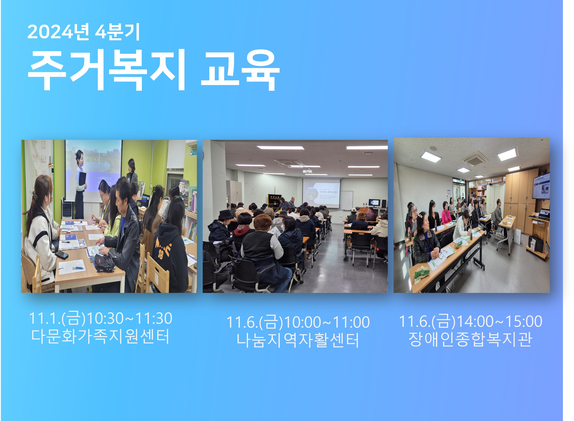 2024년 4분기 주거복지 교육 작성자 구** 등록일자 2024년 11월 10일 12시 42분 46초 조회 366 안녕하세요?주거복지센터에스는 주거복지 교육 및 홍보사업도 추진합니다.11월 초 다문화가족지원센터, 자활센터 등에서 시민, 생활지원사 등을 대상으로 교육을 진행하였습니다.주거복지에 관심이 있거나 교육을 희망하시는 기관에서는032-340-0849로 언제든지 문의 주세요! 2.jpg [ Size : 526.24KB , Down : 194 ] 미리보기 다운로드 목록보기