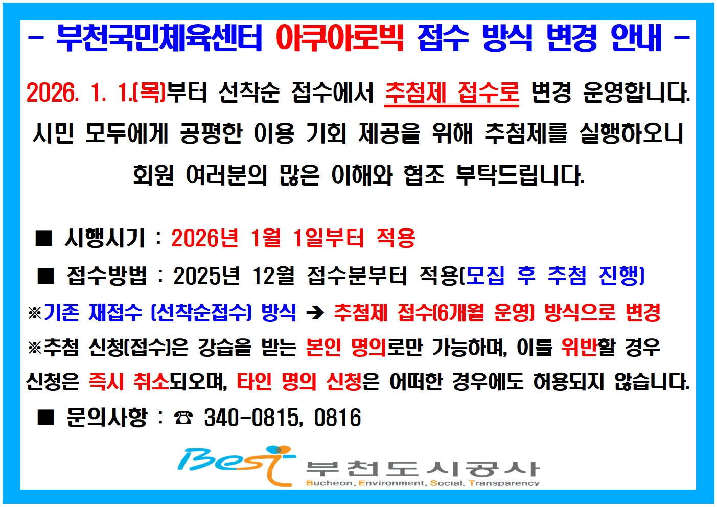 2026년 부천국민체육센터 아쿠아로빅 강습 접수 변경 안내 작성자 노** 등록일자 2025년 11월 17일 14시 42분 36초 조회 83 아쿠아로빅 접수방식2001.jpg [ Size : 674.81KB , Down : 94 ] 미리보기 다운로드 목록보기